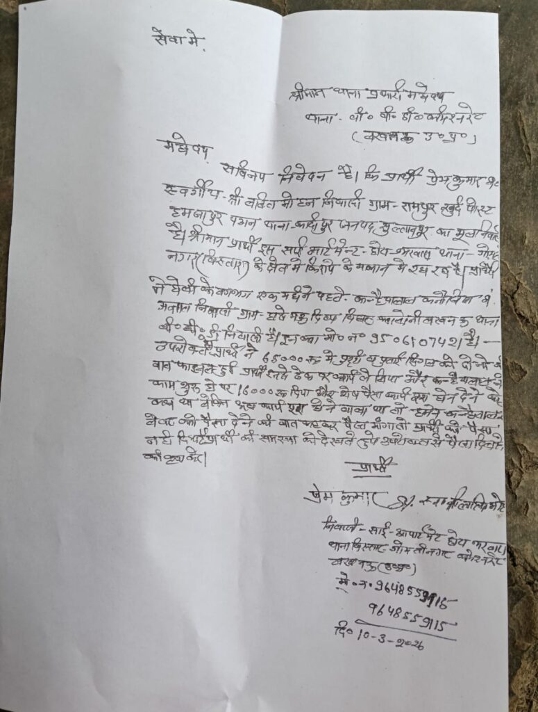 छोटा बरवाड़ा क्रॉसिंग के पास प्रेम कुमार सन ऑफ स्वर्गीय श्री ललित मोहन निवासी ग्राम रामपुर खुर्द हमजा पुर पठान कादीपुर जनपद सुलतानपुर का मूल निवासी है प्रेम कुमार पिछले कई दिनों से साई अपार्टमेंट में जो छोटा भरवारा थाना गोमती नगर विस्तार क्षेत्र में किराए के मकान में रह रहा है प्राथी ने होली के लगभग 1 महीने पहले कन्हैयालाल कनौजिया सन ऑफ अज्ञात निवासी ग्राम दिव्या विहार कॉलोनी लखनऊ थाना बी बी डी निवासी है इनका मोबाइल नंबर है 950 6107 421 उपरोक्त प्रार्थी ने₹65000 मैं पुट्टी का पुताई सिंगल फाइनल हुई प्रथी इंसेंट ठेके पर कार्य ले लिया और कन्हैयालाल ने काम शुरू होने पर 16000 रुपया दिया और से पैसा कार्य पूरा होने पर देने को कहा लेकिन अब कर पूरा होने वाला था तो हमसे कन्हैया लाल मजदूर का पैसा देने की बात काट कर पैसा मांगा तो प्रार्थी को पैसा नहीं दिया प्रार्थी की समस्या को देखते हुए उपरोक्त से पैसा दिलाने की कृपा करें
