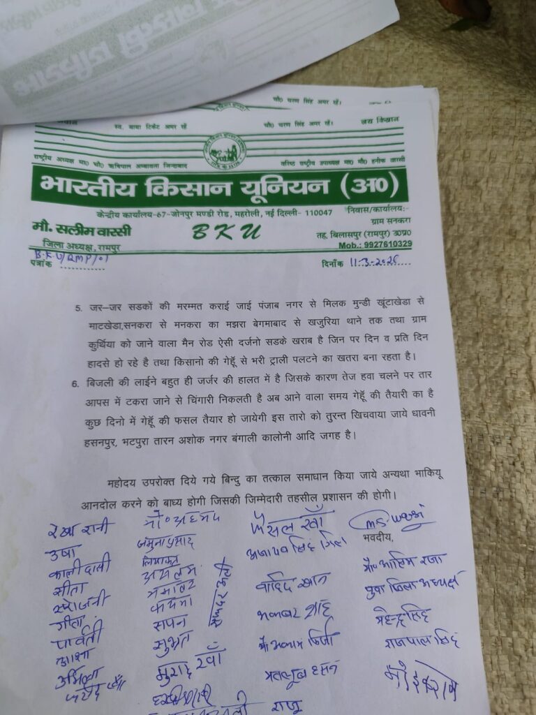 आज दिनांक 11 मार्च 2026 को भारतीय किसान यूनियन अंबावता के कार्यकर्ता व पदाधिकारी पूर्व जिला अध्यक्ष मोहम्मद सलीम वारसी के नेतृत्व में बिलासपुर तहसील परिसर के पार्क में एकत्र हुए और दरिया बिछाकर बैठ गए किसनों की समस्याओं पर गंभीर चर्चा करते हुए 6 सूत्र ज्ञापन उप जिला अधिकारी महोदय के नाम बनाया पार्क से नारेबाजी करते हुए यूपी जिला अधिकारी महोदय के कार्यालय के सामने जोरदार प्रदर्शन करने लगे किसने की आवाज सुनकर एसडीम अरुण कुमार किसानों के बीच पहुंचे किसानों की समस्याओं को सुना और शीघ्र ही समाधान करने का आश्वासन दिया इससे पहले किसानों को संबोधित करते हुए पूर्व जिला अध्यक्ष मोहम्मद सलीम वारसी ने कहा कि किसने की फसल तैयार होने को है इसलिए गेहूं को समय से चालू कराया जाए और किसने की खतौनियों का पंजीकरण बिना देरी कराए कराया जाए और बिचौलियों को गेहूं के केंद्र से बाहर रखा जाए जिससे किसानों को सरकारी मूल्य का लाभ मिल सके पूरी तहसील क्षेत्र में आवारा पशुओं का किसने की फसलों में आतंक मचा रखा है खड़ी फसल को उजाड़ रहे हैं इन पशुओं को पकड़वाकर गौशाला भेजा जाए ग्राम धमनी हसनपुर में सफाई का बहुत बुरा हाल है नालियों में गंदगी से भरी पड़ी है तथा मैं रास्तों पर पड़े सिल्प टूटे पड़े हैं जिसके कारण आए दिन हादसा हो जाता है तथा कई जानवरों के पैर टूट चुके हैं केमरी बिलासपुर रोड सरकारी स्कूल के पास पर गंदगी के ढेर लगे हुए हैं जिस कारण गांव में कई बीमारियों का प्रकोप तड़प रहा है नहरों से अवैध कब्जे हटवाए जाएं रामपुर रोड रिलायंस पेट्रोल पंप के पीछे एवं बिलासपुर के आदि रम्पुरा माइनर कायमगंज पर अवैध कब्जे हटवाए जाएं और पानी टेल तक पहुंचाया जाए जर्जर सड़कों की मरम्मत कराई जाए पंजाब नगर से मिल्क मंडी खुटा खेड़ा से माठखेड़ा सनकरा से मनकरा का माजरा बेगमाबाद से खजुरिया थाना तक तथा ग्राम कुर्तियां को जाने वाला में रोड ऐसी जगह दर्जनों सड़के खराब है जिन पर आये दिन हाथसे हो रहे हैं तथा किसानों की गेहूं से भरी ट्राली पलटने का खतरा बना रहता है बिजली की लाइन बहुत ही जर्जर की हालत में है जिसके कारण तेज हवा चलने पर तार आपस में टकरा जाने से चिंगारी निकलती है अब आने वाला समय गेहूं की तैयारी का है कुछ दिनों में गेहूं की फसल तैयार हो जाएगी इस तारों को तुरंत खिंचवाया जाए धमनी हसनपुर भटपुरा थाना अशोकनगर बंगाली कॉलोनी आदि जगहों पर धरना प्रदर्शन करने वालों में मोहम्मद अहमद प्रधान जमुना प्रसाद रेखा रानी मुस काली देवासी लियाकत सफदर अली फैसल खान महेंद्र सिंह हरदीप सिंह असलम मतलूब हसन नाथूलाल असलम सपन सुकरात संजीत फरीद खान उर्मिला आशा आशा पार्वती गीता सरोजिनी सीता राजू अकबर शाह वाहिद खान महेंद्र सिंह राजपाल मोहम्मद इकराम
