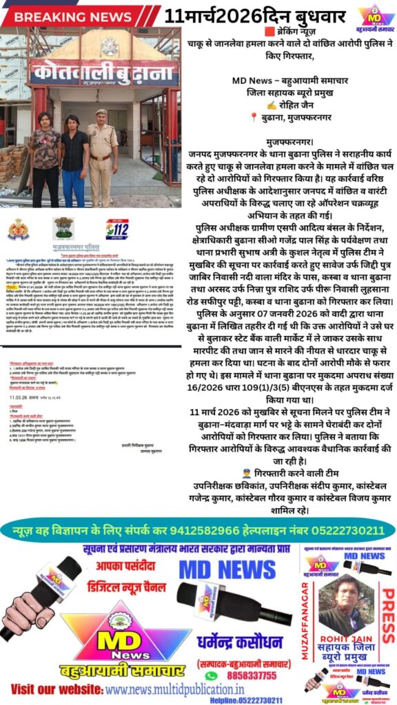 जनपद मुजफ्फरनगर के थाना बुढाना पुलिस ने सराहनीय कार्य करते हुए चाकू से जानलेवा हमला करने के मामले में वांछित चल रहे दो आरोपियों को गिरफ्तार किया है। यह कार्रवाई वरिष्ठ पुलिस अधीक्षक के आदेशानुसार जनपद में वांछित व वारंटी अपराधियों के विरुद्ध चलाए जा रहे ऑपरेशन चक्रव्यूह अभियान के तहत की गई।