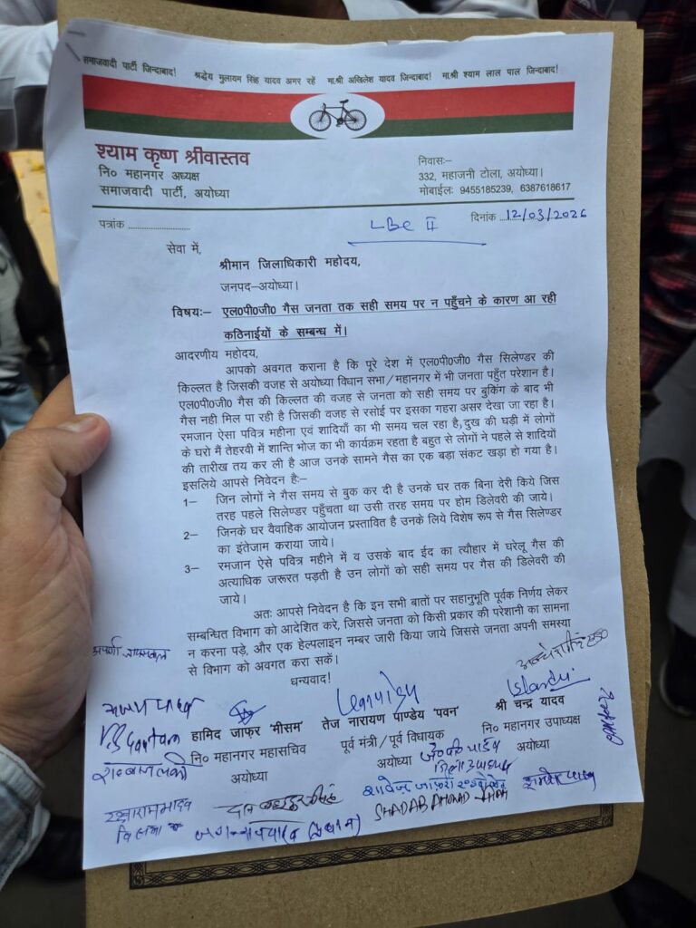 आज पूर्व मंत्री तेज नारायण पांडे पवन के नेतृत्व में एलoपीoजीo गैस जनता तक सही समय में न पहुंचने एवं आ रही परेशानी को देखते हुए जिला अधिकारी अयोध्या संबोधित ज्ञापन सिटी मजिस्ट्रेट को सौपा गया प्रवक्ता राकेश यादव एडवोकेट ने बताया ज्ञापन के माध्यम से मांग की गई की पूरे देश में एलपीजी गैस सिलेंडर की किल्लत है जिसकी वजह से अयोध्या विधानसभा/ महानगर अयोध्या की जनता बहुत परेशान है एलपीजी गैस की किल्लत की वजह से जनता को सही समय पर बुकिंग के बाद भी गैस नहीं मिल पा रही है जिसकी वजह से रसोई पर इसका गहरा असर देखा जा रहा है ,पूर्व मंत्री तेज नारायण पांडे पवन ने कहा कि रमजान जैसा पवित्र महीना एवं शादिया व भंडारे का भी समय चल रहा है एवं दुख की घड़ी में लोगों के घरों में तेहरवी मे शांति भोज का कार्यक्रम भी रहता है बहुत से लोगों ने पहले से शादियों की तारीख तय कर ली है आज उनके सामने गैस का बहुत बड़ा संकट खड़ा हो गया है ,भारतीय जनता पार्टी के नेता मीडिया मे बैठकर झूठ बोल रहे है कि गैस की कोई दिक्कत नहीं है बल्कि सच ये है कि वो अपने खास लोगों को गैस दिला दे रहे और जनता को गुमराह कर रहे है उन्हें जनता की परेशानी से कोई लेना देना नहीं है, पूर्व मंत्री ने कहा कि जिन लोगों ने गैस समय से बुक कर दी है उनके घर तक बिना देरी किए हुए जिस तरह से पहले सिलेंडर पहुंचता था उसी तरह समय से होम डिलीवरी की जाए एवं जिनके घर वैवाहिक आयोजन प्रस्तावित है उनके लिए विशेष रूप से गैस सिलेंडर के इंतजाम कराया जाए एवं रमजान ऐसे पवित्र महीने में व उसके बाद ईद के त्यौहार में घरेलू गैस की अत्यधिक जरूरत पड़ती है ऐसे समय में उन लोगों को सही समय में गैस सिलेंडर की डिलीवरी की जाए एवं एक हेल्पलाइन नंबर जारी किया जाए जिससे जनता अपनी समस्या संबंधित विभाग को अवगत करा सके जिससे जनता को किसी प्रकार की परेशानी का सामना न करना पड़े!!इस मौके पर महानगर महासचिव हामिद जाफर मीसम,उपाध्यक्ष श्रीचंद यादव, अयोध्या विधानसभा अध्यक्ष रक्षा राम यादव, महिला महानगर अध्यक्ष अपर्णा जयसवाल, उपाध्यक्ष राकेश पांडे,प्रवीण राठौर, रियाज अहमद,अधिवक्ता सभा राष्ट्रीय महासचिव एडवोकेट शावेज जाफरी, महानगर अध्यक्ष अधिवक्ता सभा लाल बहादुर शुक्ल, मंसूर इलाही एडवोकेट, शादाब खान, जगदीश यादव, जगन्नाथ यादव, वीरेंद्र गौतम,अमृत राजपाल, शिक्षक सभा जिला अध्यक्ष दान बहादुर सिंह, जेपी यादव,आरोनी पासवान,अजय यादव, शमशेर यादव, शहबाज लकी, राम आजोर यादव, ऋतुराज सिंह, प्रदेश सचिव पिछड़ा बृजेश सिंह चैहान, पूनम साहू, फहमीदा कुरैशी, रुक्मणी, ममता गुप्ता, एडवोकेट शशांक यादव, विजय नारायण यादव,नूर बाबू, रामचरण यादव, आशीष बर्मा, सुरेंद्र यादव, शिवपाल, महफूज उस्मानी, मुकेश,संजय यादव,नेहा यादव, अखिलेश यादव आ