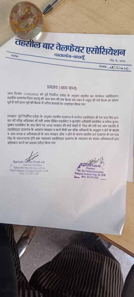 दातागंज -दातागंज तहसील बार वेलफेयर एसोसिएशन दातागंज का एक प्रतिनिधिमंडल जिला बार वेलफेयर एसोसिएशन के जिला वार के अध्यक्ष एवं महासचिव को साथ लेकर जिलाधिकारी बदायूं के कार्यालय में जाकर मिले एवं दातागंज तहसीलदार के न्यायालय में बीती 28 फरवरी को घटित घटना के संदर्भ में विस्तार से बताया उन्होंने कहा तहसीलदार दातागंज का रवैया अधिवक्ताओं एवं आम जनता के प्रति संतोषजनक नहीं है उनकी कार्यशैली एक अधिकारी की न होकर राजनेता की है वार की पूर्व अध्यक्ष आशा दिक्षित, कुलदीप अग्निहोत्री एवं राकेश पुष्कर के साथ हुए दुर्व्यवहार के कारण तहसीलदार दातागंज न्यायालय का निरंतर बहिष्कार चल रहा है जिससे बाद कारियो को परेशानी का सामना करना पड़ रहा है उनके कार्य प्रणाली की जांच एवं उनके शीघ्र स्थानांतरण की मांग जिला अधिकारी के समक्ष रखी जिला अधिकारी ने जिलाधिकारी बदायूं में वकीलों की आप को सुनकर देव उचित कार्रवाई का शासन दिया है। आज जिलाधिकारी को पत्र देते समय देवपल सिंह, महासचिव संदीप कुमार मिश्रा, दातागंज बार के अध्यक्ष अजय कुमार गुप्ता महासचिव संतोष कुमार सिंह बार के पूर्वअध्यक्ष , पूर्व अध्यक्ष नगर पालिका परिषद दातागंज मोहम्मद इसहाक एडवोकेट, श्रीमती आशा दिक्षित ,ओमपाल सिंह सहित अन्य अधिवक्ता थे। इस संदर्भ में अध्यक्ष अजय कुमार गुप्ता ने कहा है कि कल बार भवन में बैठक कर आगे की रणनीति आम अधिवक्ताओं की सहमति से आज के घटनाक्रम को बता कर तैय की जाएगी।जिलाधिकारी दिए पत्र की प्रति