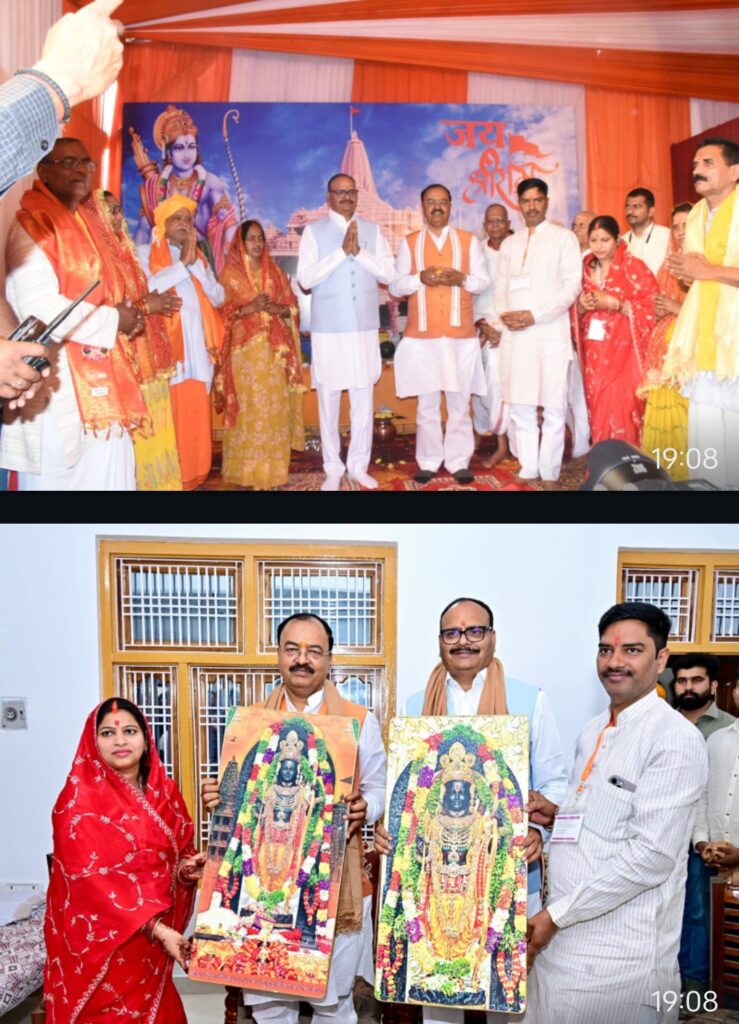 अयोध्या। जनपद के सरायरासी स्थित जिला पंचायत अध्यक्ष रोली सिंह के निवास पर आयोजित ‘श्री राम कथा महोत्सव’ के प्रथम दिवस प्रदेश के उप मुख्यमंत्री केशव प्रसाद मौर्य एवं बृजेश पाठक कथा स्थल पर पहुंचे। दोनों उप मुख्यमंत्रियों ने विधि-विधान से पूजन-अर्चन कर प्रभु श्रीराम का आशीर्वाद लिया तथा जिला पंचायत अध्यक्ष रोली सिंह व परिवारजनों से भेंट कर उनका कुशलक्षेम जाना।