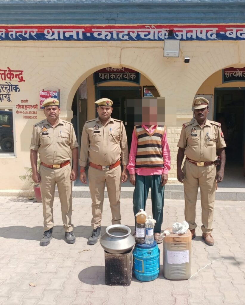 बदायूं,वरिष्ठ पुलिस अधीक्षक जनपद बदायूँ, सुश्री अंकिता शर्मा के आदेशानुसार एवं अपर पुलिस अधीक्षक नगर बदायूँ के निर्देशन एवं क्षेत्राधिकारी उझानी सीओ के पर्यवेक्षण में अवैध शराब की तस्करी करने वाले अभियुक्तो के विरुद्ध चलाए जा रहे अभियान के अन्तर्गत आज दिनांक 21.03.2026 को थाना कादरचौक पुलिस द्वारा मुखबिर की सूचना पर 01 अभियुक्त सूरजपाल पुत्र कल्यान सिंह निवासी ग्राम ककोडा थाना कादरचौक बदायूं को ग्राम ककोडा के जंगल से खेत पर बनी झोपडी से मय शराब बनाने के उपकरण व एक जरीकैन प्लास्टिक मे 20 लीटर शराब खाम सहित गिरफ्तार किया गया जिसके सम्बन्ध में थाना कादरचौक पर मु0अ0सं0 72/2026 धारा 60(2) Ex Act बनाम सूरजपाल उपरोक्त पंजीकृत किया गया । गिरफ्तार अभियुक्त को हिरासत पुलिस मे लेकर मा0 न्ययालय के समक्ष पेश किया गया। गिरफ्तार करने वाली टीम उ0नि0 इन्द्रवीर सिंह मय पुलिस टीम