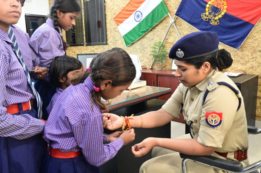 औरैया-रक्षाबंधन कार्यक्रम बाल विकास ज्ञान मंदिर स्कूल की छात्राओं ने पुलिस मुख्यालय ककोर आकर पुलिस अधीक्षक महोदया औरैया श्रीमती चारू निगम को राखियां बांधी व इसके बाद छात्राओं ने ऑफिस में तैनात सभी पुलिस अधिकारियों व कर्मचारीगणों को भी राखी बांधी।
