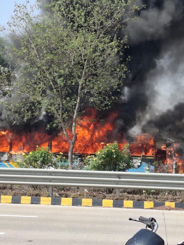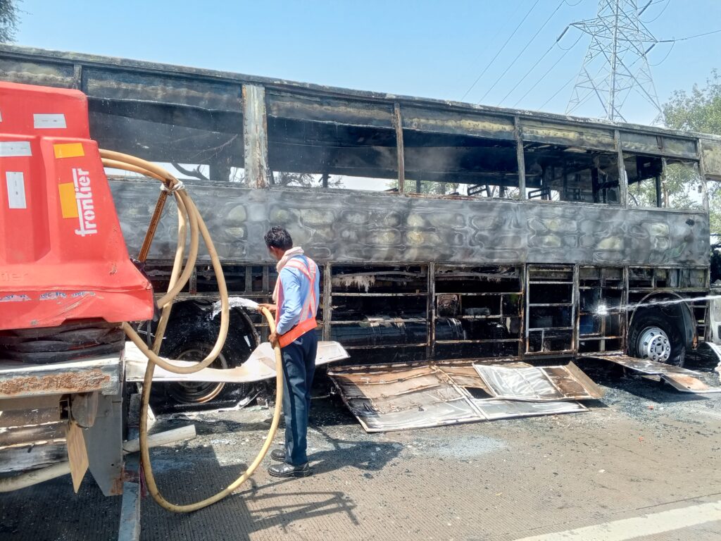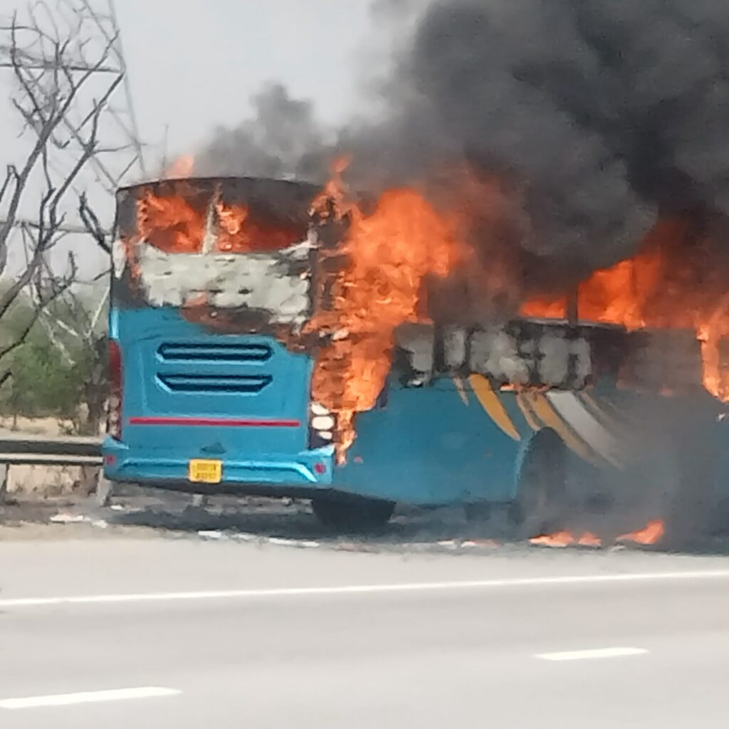 बाजना(मथुरा)।बाजना कट पर 29/03/2026 दिन रविवार को एक मामला सामने आया है बाजना कट पर आगरा से दिल्ली जा रही बस में शॉर्ट सर्किट की वजह से सुबह 10:30 बजे आग लग गई। धीरे धीरे आग इस तरह बढ़ी कि पूरी तरह से जलकर तबाह हु गई। बताया जा रहा कि बस 48 पैसेंजर थे जिसमे कुछ महिलाएं कुछ बच्चे और कुछ पुरुष थे।जैसे आग का घना धुंआ ऊपर स्थानीय लोगों वहां पहुंचे उन्होने तुरंत पुलिस को सूचना दी मौके पर पहुंचकर पुलिस ने फायरब्रिगेड, एंबुलेंस को सूचित किया।और फायरब्रिगेड और यमुना एक्सप्रेस के कर्मचारियों ने आग को बुझाया गया।बताया जा रहा कि किसी भी पैसेंजर को कोई नुकसान नहीं हुआ बस की खिड़की दरवाजे खुले होने पर उन्हें सुरक्षित निकला गया और उन्हें दूसरी बसे दिल्ली भेजा गया।