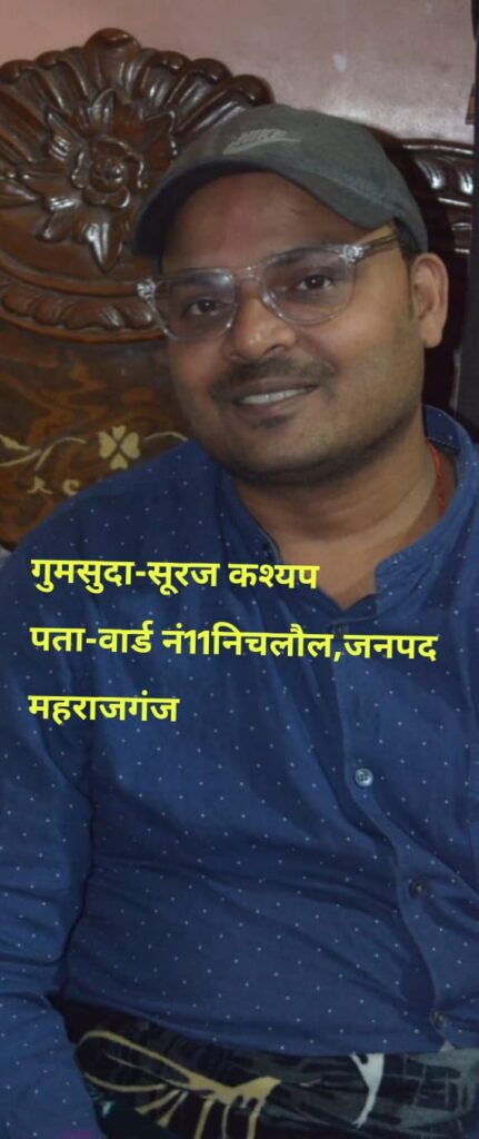 महराजगंज। निचलौल नगर के वार्ड नं-11 निवासी सूरज कश्यप पुत्र श्रीनिवास कश्यप दिनाँक 28 मार्च को शाम लगभग 07:40PM पर घर से किसी बात पर नाराज होकर अपने सुपर स्प्लेंडर बाइक जिसका न. UP56AK6430 से निकल गया।परिजनों द्वारा काफी खोजबीन किया गया और सूरज से संपर्क साधने की कोशिश की गई लेकिन सूरज का फोन रिसीव नही हुआ।और मध्य रात्रि तक सूरज का नम्बर बन्द बताने लगा।