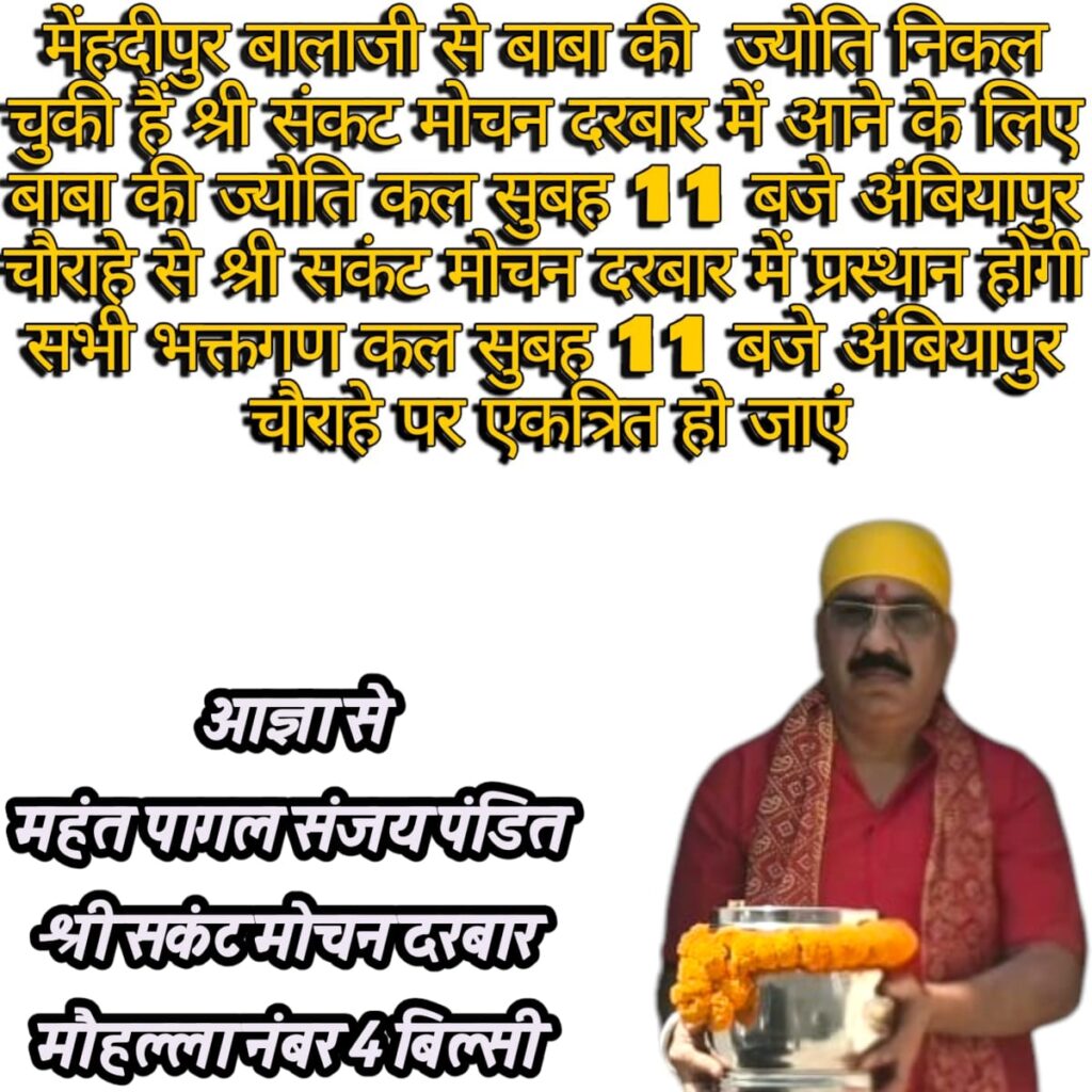 जानकारी के अनुसार, यह पावन ज्योति कल सुबह 11 बजे अंबियापुर चौराहे से भव्य जुलूस के रूप में श्री संकट मोचन दरबार, मोहल्ला नंबर 4 बिल्सी के लिए प्रस्थान करेगी। आयोजन को लेकर सभी तैयारियां पूरी कर ली गई हैं और बड़ी संख्या में श्रद्धालुओं के शामिल होने की संभावना है।