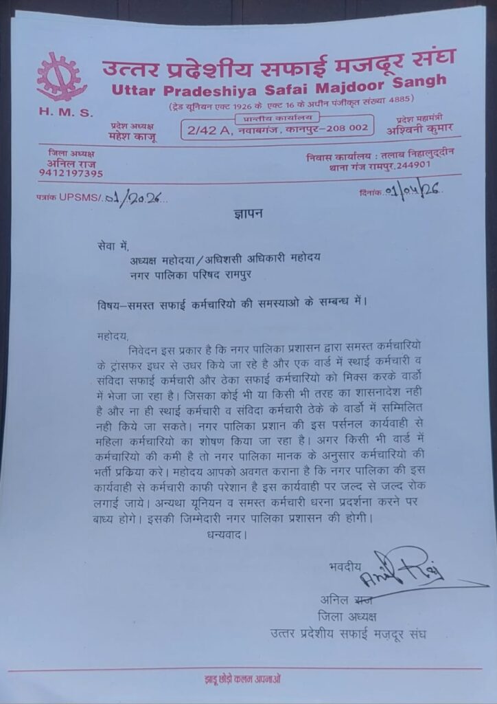 आज दिनांक 01-04-2026 को सुबह 11.00 बजे जिला अध्यक्ष अनिल राज जी उत्तर प्रदेशीय सफाई मजदूर संघ रामपुर के नेतृत्व में समस्त कर्मचारियों के स्थानांतरण को लेकर पालिका अध्यक्ष एवं अधिशासी अधिकारी महोदय रामपुर को एक ज्ञापन सौपा गया। जिसमें मुख्य रूप से समस्त कर्मचारियों के स्थानांतरण को लेकर वार्ता की गई ,जिसमें पालिका अध्यक्ष एवं अधिशासी अधिकारी महोदय जी ने उत्तर प्रदेशीय सफाई मजदूर संघ के जिला अध्यक्ष अनिल राज को पूर्ण रूप से विश्वास दिलाया है, कि समस्त कर्मचारियों के स्थानांतरण में जल्द ही संशोधन कर के और खास कर महिला कर्मचारी का स्थानांतरण ना किया जाये ,जिससे की उन्हें अपने कार्य मे किसी भी तरहा की बाधा न आये।और अन्य कर्मचारियों को भी राहत दी जाएगी। ज्ञापन में मुख्य रूप से नवीन कुमार उर्फ़ सोनू जिला महासचिव उत्तर प्रदेशीय सफाई मजदूर संघ,छोटे भीम,रोहित राज,यश,कौशल,अविनाश,मुकेश,राजकुमार,माला,विजय,ममता, ऋतु,विक्की, अमित, ऊषा, अमर किशोर,कमलेश, रीना, सुनीता,आदि कर्मचारी उपस्थित रहे।