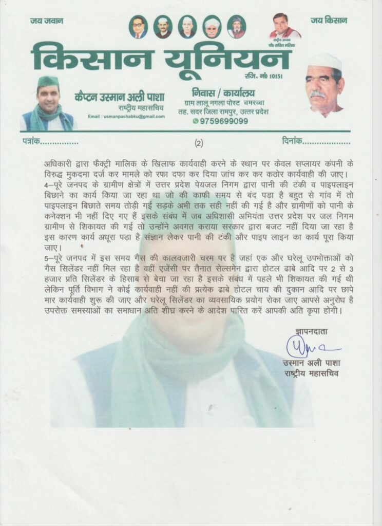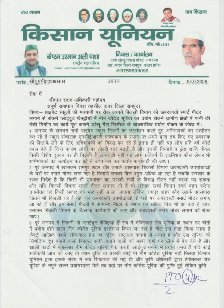 शनिवार रामपुर पूर्व निर्धारित कार्य क्रम के अंतर्गत किसान यूनियन के पदाधिकारी व कार्यकर्ता राष्ट्रीय महासचिव उस्मान अली पाशा के नेतृत्व में तहसील सदर परिसर में एकत्रित हुए और जोरदार प्रदर्शन करने के बाद तहसील दिवस की अध्यक्षता कर रहे जिला अधिकारी अजय कुमार द्विवेदी को पांच सूत्रीय ज्ञापन सोपा ज्ञापन में प्राइवेट स्कूलों की मनमानी बंद करने बिजली विभाग को जबरदस्ती स्मार्ट मीटर लगाने से रोकने प्लाईवुड फैक्ट्रीयों में नीम कोटेड यूरिया का प्रयोग रोकने ग्रामीण क्षेत्रों में टंकी निर्माण कार्य पूरा कराने रसोई गैस की कालाबाजारी बंद रुकने आदि मांगे शामिल हैं इस अवसर पर राष्ट्रीय महासचिव उस्मान अली पाशा ने कहा आम आदमी अपना तन पेट काटकर अपने बच्चों को पढ़ रहा है लेकिन प्राइवेट स्कूल संचालक अपनी मनमानी से उनका शोषण कर रहे हैं जनपद के सभी प्राइवेट स्कूल एनसीईआरटी पाठ्यक्रम के स्थान पर अपने द्वारा तय किए गए प्रकाशक की किताबें लेने के लिए अभिभावकों को विवश कर रहे हैं इतना ही नहीं यह लोग प्रतिवर्ष री एडमिशन फीस के नाम पर भी अभिभावकों का उत्पीड़न कर रहे हैं उन्होंने आगे कहा बिजली विभाग द्वारा लोगों के घरों पर जबरदस्ती स्मार्ट मीटर लगाए जा रहे हैं जो कि सरासर गैर कानूनी है प्रदर्शन कर ज्ञापन देने वालों में इरशाद अली पाशा नूर आलम मोहम्मद फरमान शमीम जहां अरीबा खान मोहम्मद आजम सुनील कुमार सक्सेना मोहम्मद जुनेद रुबी खान दिनेश कुमार विनोद कुमार जकी अहमद आदि लोग मौजूद रहे।