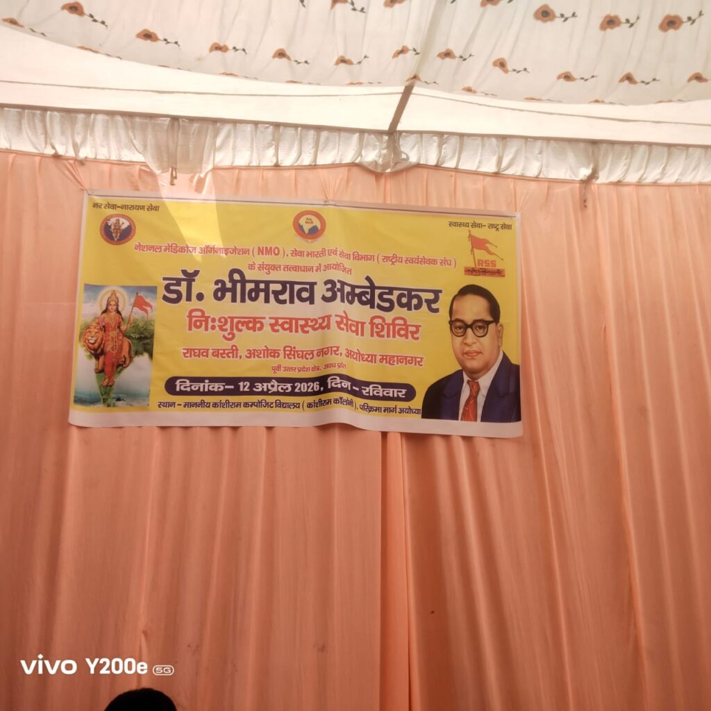 अयोध्या में (NMO), सेवा भारती और सेवा विभाग राष्ट्रीय स्वयंसेवक संघ के संयुक्त तत्वाधान में 12 अप्रैल 2026 (रविवार) को सुबह 9 से 1 बजे तक, प्राथमिक विद्यालय, काशीराम कॉलोनी, परिक्रमा मार्ग पर एक विशाल निःशुल्क स्वास्थ्य शिविर का आयोजन किया गया इस शिविर का शुभारंभ श्री राम जन्मभूमि तीर्थ क्षेत्र ट्रस्ट के महासचिव चम्पत राय जी ने दीप प्रज्ज्वलित करके किया और शिविर में डॉ संजीव थापर ( नेत्र रोग विशेषज्ञ) डॉ पीयूष गुप्ता ( फिजिशियन) डॉ पीयूष आनंद बच्चों के डॉक्टर ( डॉ आदर्श सोनकर (जनरल मेडिसिन) डॉ सत्येंद्र वर्मा (हड्डी रोग विशेषज्ञ) द्वारा सेवाए प्रदान की गई।निःशुल्क जांच, परामर्श और दवाएं निःशुल्क उपलब्ध कराई गई।शिविर में 306 लोगो ने स्वास्थ्य जाँच करवायी।