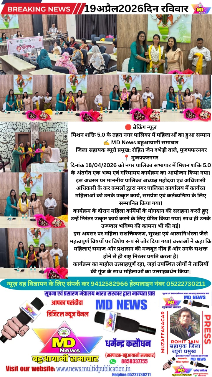 दिनांक 18/04/2026 को नगर पालिका सभागार में मिशन शक्ति 5.0 के अंतर्गत एक भव्य एवं गरिमामय कार्यक्रम का आयोजन किया गया। इस अवसर पर माननीय पालिका अध्यक्ष महोदया एवं अधिशासी अधिकारी के कर कमलों द्वारा नगर पालिका कार्यालय में कार्यरत महिलाओं को उनके उत्कृष्ट कार्य, समर्पण एवं कर्तव्यनिष्ठा के लिए सम्मानित किया गया।