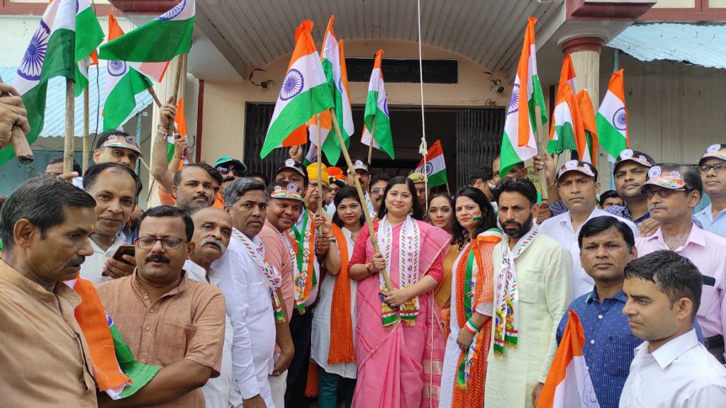 बिसौली : स्वतंत्रता के अमृत महोत्सव पर जायंट्स ग्रुप आफ बिसौली स्टार्स ने विशाल तिरंगा रैली निकाली। एसडीएम ज्योति शर्मा ने ध्वजारोहण कर रैली को अग्रवाल धर्मशाला से रवाना किया। ग्रुप के अध्यक्ष निशांत गोयल अपने साथियों के साथ आकर्षण का केन्द्र बने 51 फिट के तिरंगे को लेकर चल रहे थे। इस दौरान पूर्व विधायक कुशाग्र सागर, चेयरमैन अबरार अहमद, दुर्गेश वार्ष्णेय, सरिता वार्ष्णेय, मोनू महाजन, सचिव अनुपम वार्ष्णेय, रविन्द्र मोहन अग्रवाल आदि प्रमुखता से मौजूद रहे।