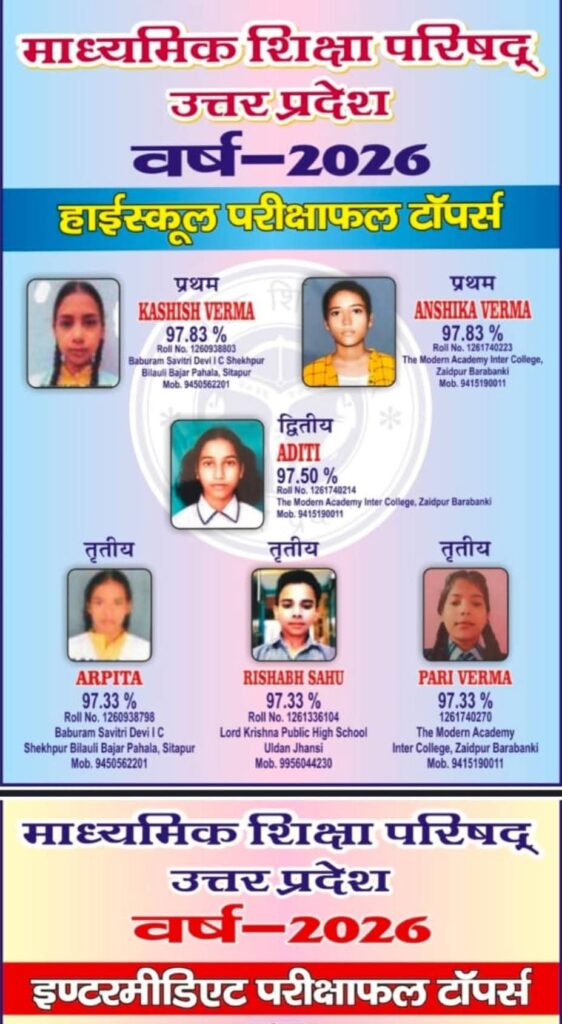 बाराबंकी यूपी बोर्ड 2026 के नतीजों में बाराबंकी जिले की बेटियों का डंका बजा है। जैदपुर की तीन छात्राओं ने हाईस्कूल में प्रदेश की टॉप-3 रैंक पर कब्जा जमाया, वहीं इंटर में भी दो बेटियों ने टॉप-3 में जगह बनाई।
