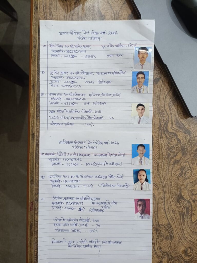 हरदोई। वर्ष 2026 की बोर्ड परीक्षाओं के परिणाम घोषित होने के बाद क्षेत्र के विद्यार्थियों में खुशी की लहर दौड़ गई। इंटरमीडिएट और हाईस्कूल दोनों ही स्तरों पर छात्र-छात्राओं ने उत्कृष्ट अंक प्राप्त कर विद्यालय और अपने अभिभावकों का नाम रोशन किया है। इंटरमीडिएट की परीक्षा में शौर्य मिश्रा (सुपुत्र श्री अमित कुमार) ने 88.8% अंकों के साथ विद्यालय में प्रथम स्थान प्राप्त किया। वहीं, सुमित कुमार ने 88.2% अंक पाकर द्वितीय और श्याम लाल ने 87% अंकों के साथ तृतीय स्थान हासिल किया हाईस्कूल के परिणामों ने इस बार विशेष गौरव बढ़ाया है। सार्थक द्विवेदी (सुपुत्र श्री शिव प्रकाश) ने 93.67% जैसे रिकॉर्ड अंकों के साथ न केवल विद्यालय में प्रथम स्थान पाया, बल्कि जनपद की मेरिट सूची में 9वाँ स्थान भी सुरक्षित किया।