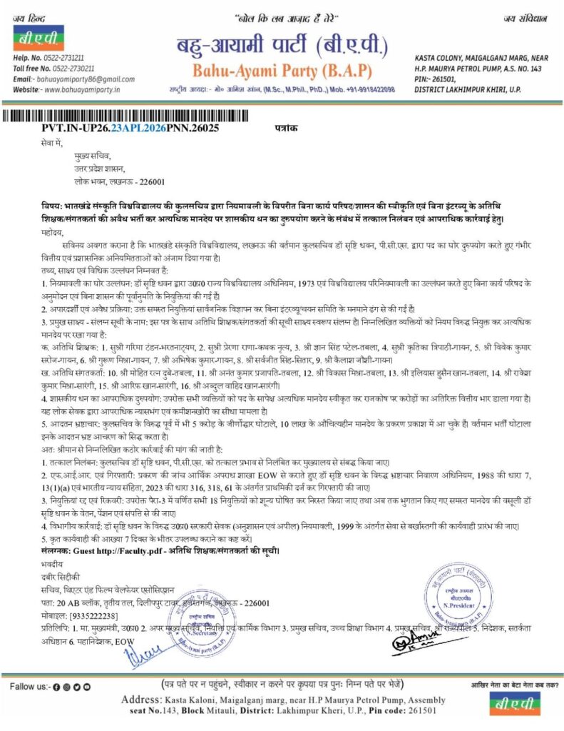 सविनय अवगत कराना है कि भातखंडे संस्कृति विश्वविद्यालय, लखनऊ की वर्तमान कुलसचिव डॉ सृष्टि धवन, पी.सी.एस. द्वारा पद का घोर दुरुपयोग करते हुए गंभीर वित्तीय एवं प्रशासनिक अनियमितताओं को अंजाम दिया गया है।
