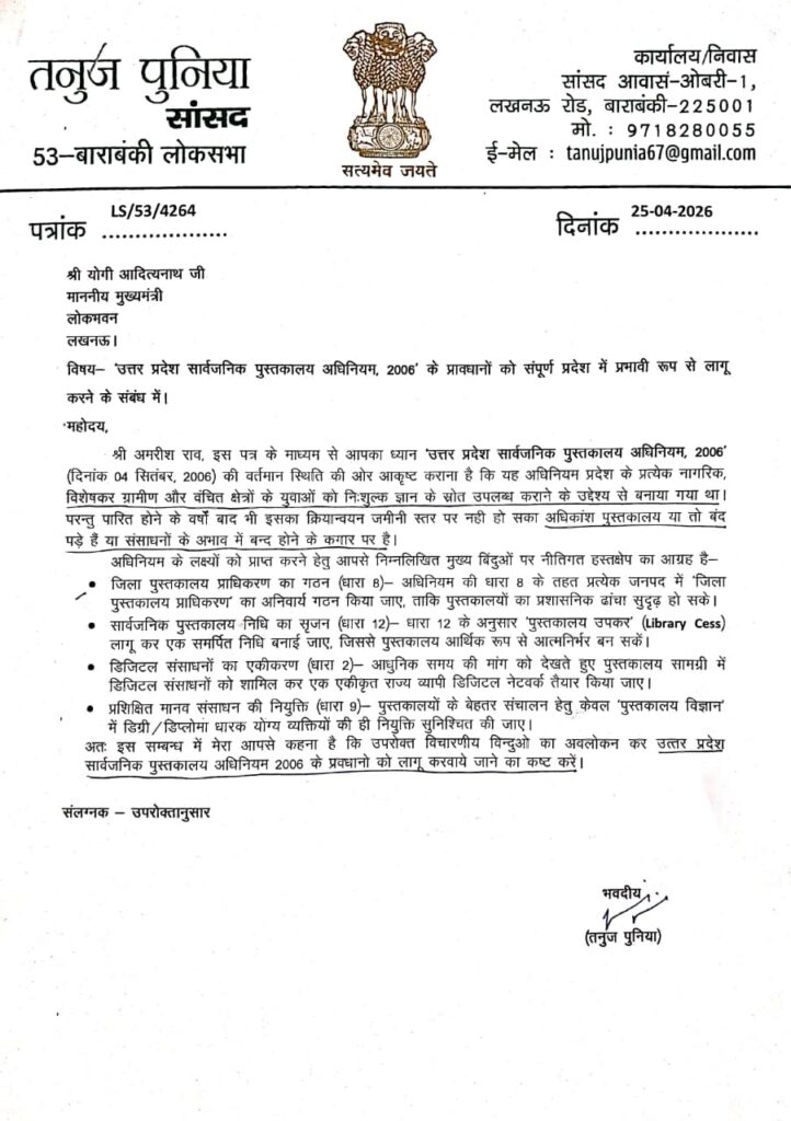 उत्तर प्रदेश में सार्वजनिक पुस्तकालय अधिनियम 2006 दिनांक 4 दिसम्बर 2006 की वर्तमान स्थिती की ओर आकृष्ट कराना है कि, यह अधिनियम प्रदेश के प्रत्येक नागरिक, विशेषकर ग्रामीण और वंचित क्षेत्रों के युवाओं को निःशुल्क ज्ञान के स्रोत को उपलब्ध कराने के उद्देश्य से बनाया गया था।