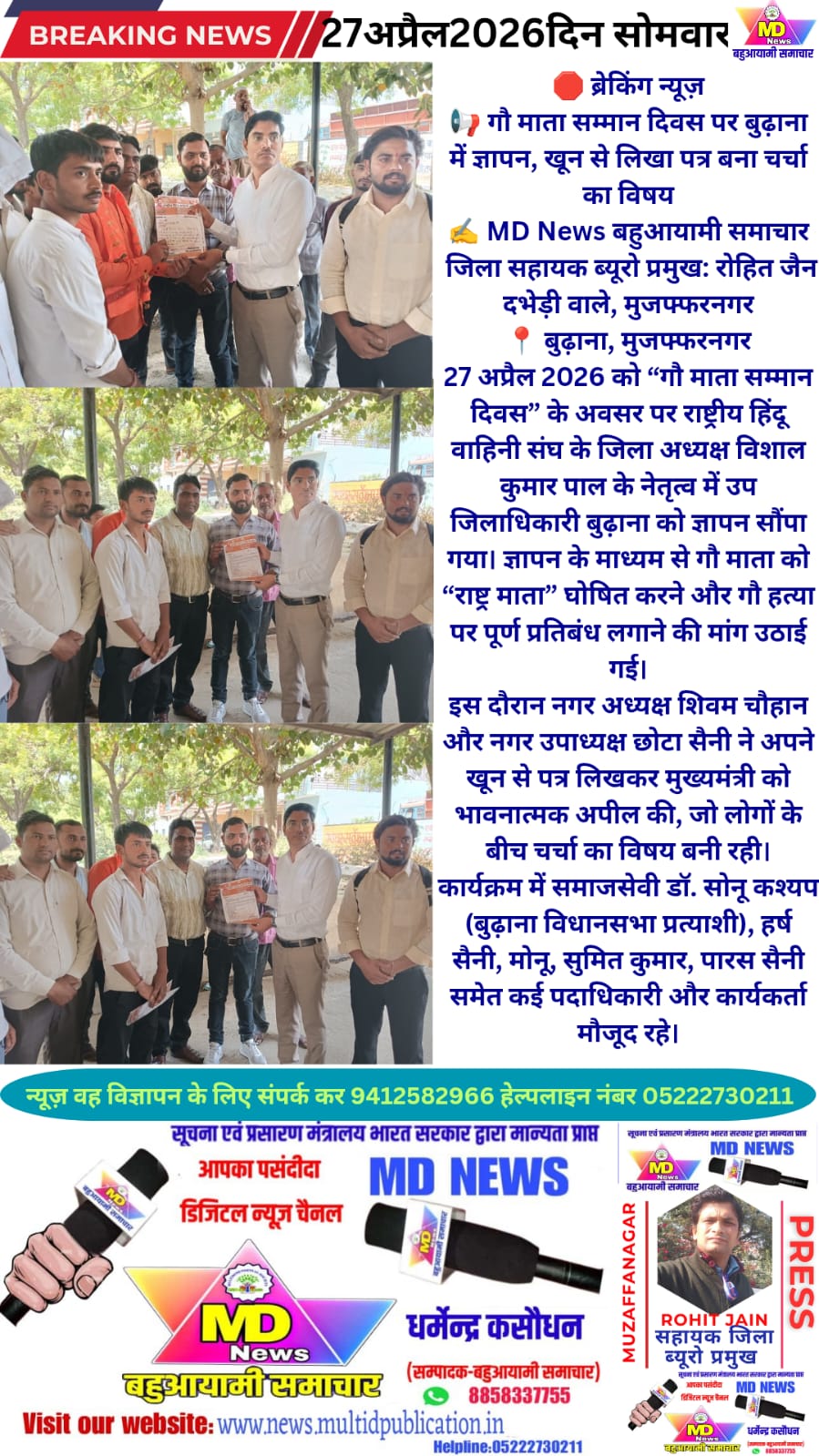 27 अप्रैल 2026 को “गौ माता सम्मान दिवस” के अवसर पर राष्ट्रीय हिंदू वाहिनी संघ के जिला अध्यक्ष विशाल कुमार पाल के नेतृत्व में उप जिलाधिकारी बुढ़ाना को ज्ञापन सौंपा गया। ज्ञापन के माध्यम से गौ माता को “राष्ट्र माता” घोषित करने और गौ हत्या पर पूर्ण प्रतिबंध लगाने की मांग उठाई गई।