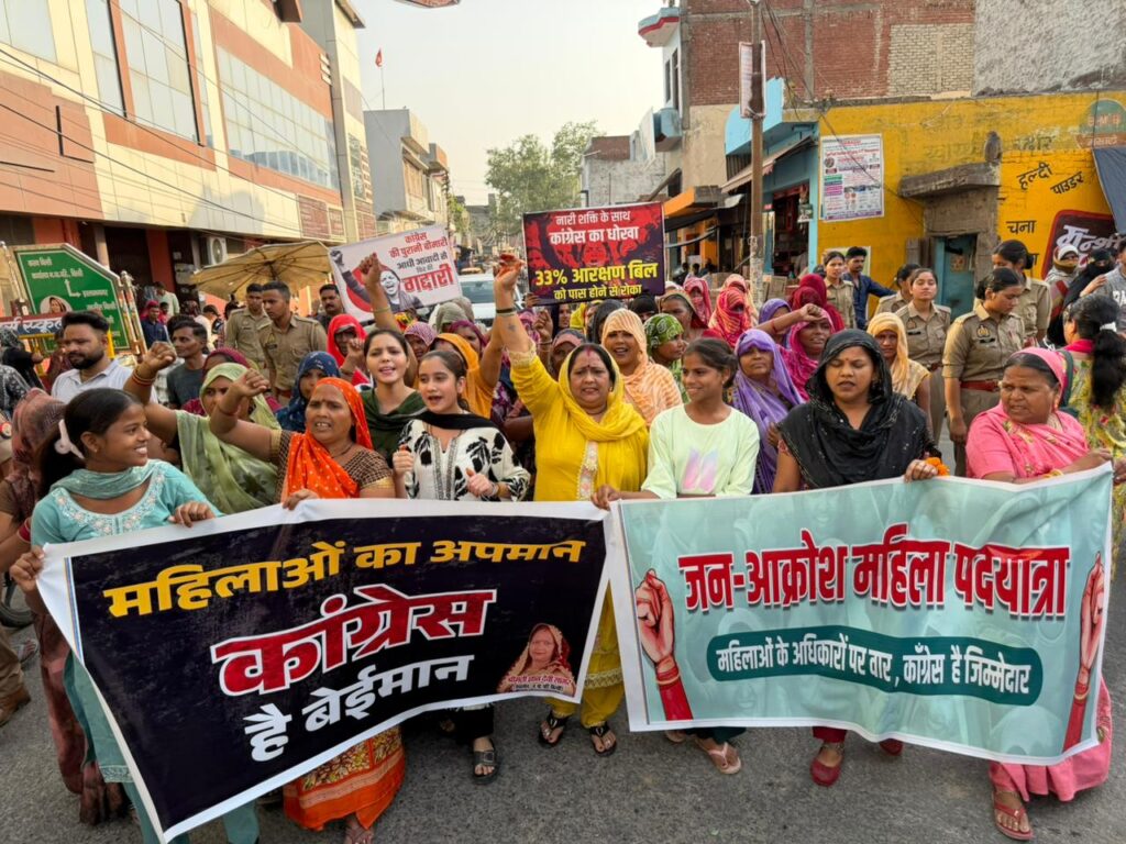 बिल्सी ।उत्तर प्रदेश के जनपद बदायूं के उपनगर बिल्सी में महिला जनाक्रोश मार्च अभियान के अंतर्गत बिल्सी विधानसभा के बिल्सी नगर मंडल में नगर पालिका परिषद बिल्सी से मुख्य बाजार थाना मोड़ तक मार्च का नेतृत्व पालिकाध्यक्ष ज्ञान देवी सागर ने किया। साथ ही महिलाओं द्वारा विशाल मार्च के दौरान हाथों में तख्तियां और नारों के साथ महिलाओं ने कांग्रेस एवं समाजवादी पार्टी के खिलाफ अपना आक्रोश व्यक्त किया तथा महिलाओं ने नारेबाजी करते हुए थाने मोड़ पर अपना आक्रोश यात्रा का समापन किया । इस अवसर पर नेहा सभासद, ममता देवी,संगीता सागर ,कमलेश कुमारी, कविता सागर समेत अनेक महिला मौजूद रही ।