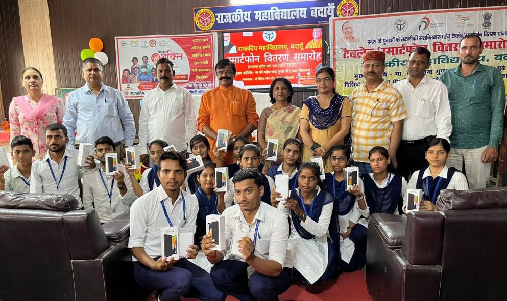 बदायूं : आवास विकास स्थित राजकीय महाविद्यालय में बीए बीएससी एवं बीकॉम तृतीय वर्ष के छात्र छात्राओं को उत्तर प्रदेश सरकार के निशुल्क स्मार्टफोन वितरण योजना के अंतर्गत स्मार्टफोन वितरित किया गया। मुख्य अतिथि सदर विधायक महेश चंद्र गुप्ता ने मां सरस्वती की प्रतिमा के समक्ष दीप प्रज्वलन एवं स्वामी विवेकानंद व डॉ भीमराव अंबेडकर के चित्र पर माल्यार्पण कर कार्यक्रम का उद्घाटन किया। मुख्य अतिथि ने स्मार्टफोन वितरित करने के बाद छात्र छात्राओं को संबोधित करते हुए कहा कि युवाओं की तकनीकी दक्षता व बौद्धिक सशक्तिकरण की दिशा में स्मार्टफोन लाभकारी सिद्ध होंगे।