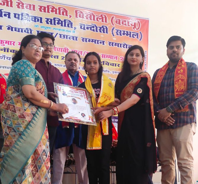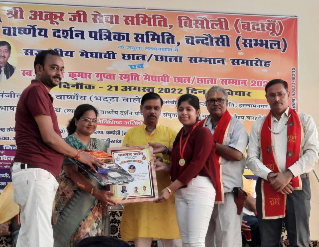 बिसौली : श्री अक्रूर जी सेवा समिति व वार्ष्णेय दर्शन मासिक पत्रिका समिति के संयुक्त तत्वावधान में सजातीय मेधावी छात्र छात्रा सम्मान एवं स्वर्गीय अनिल कुमार गुप्ता स्मृति मेधावी छात्र छात्रा सम्मान प्रदान किए गए। समारोह में बच्चों ने सांस्कृतिक कार्यक्रम प्रस्तुत कर सभी का मन मोह लिया । नगर स्थित साईं के एस होम में आयोजित सम्मान समारोह का शुभारंभ अतिथियों ने अक्रूरजी महाराज के चित्र के समक्ष दीप प्रज्ज्वलित कर किया। कार्यक्रम में संविलियन विद्यालय पैगा भीकमपुर की छात्राओं ने देशभक्ति गीतों पर मनमोहक नृत्य प्रस्तुत कर समां बांध दिया। युवा गायक गगन वार्ष्णेय अध्यापक, शशांक भिल्ला, विनोद वार्ष्णेय, चिराग वार्ष्णेय एवं शैलेन्द्र वार्ष्णेय ने मधुर गीत सुनाकर सभी को झूमने पर मजबूर कर दिया। मासूम बालक सत्यम वार्ष्णेय ने पियानो के साथ कर्पूर गौरं करुणावतारम और अच्युतम केशवं .. गाकर पंडाल में मौजूद।