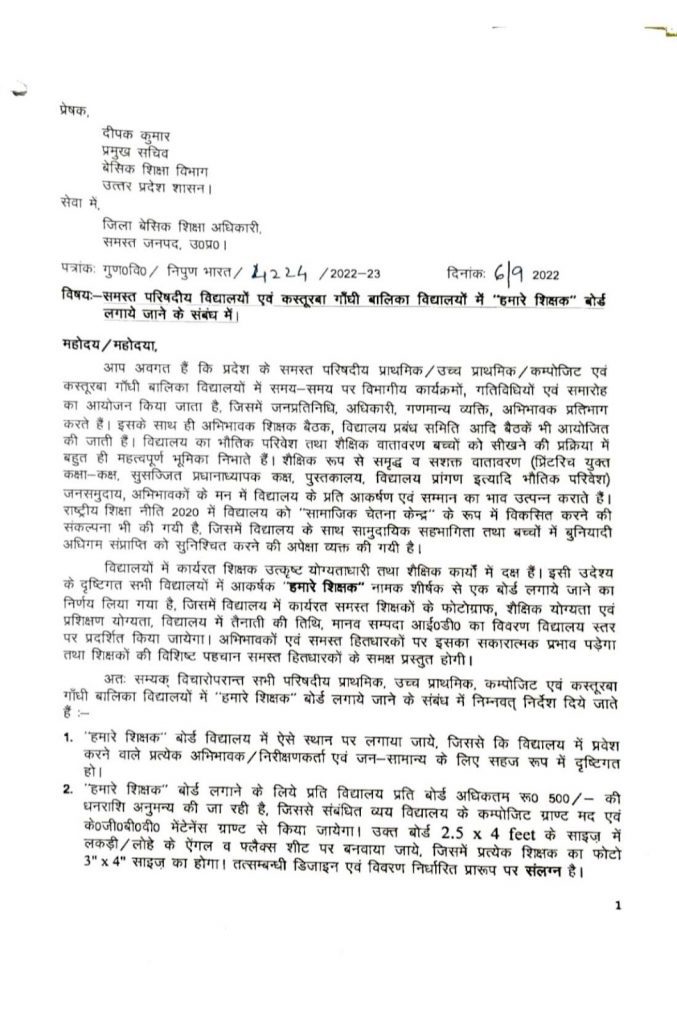बोर्ड पर तैनाती अवधि लिखे होने से अव्यवस्था मिलने पर ठीकरा भी उन्हीं के सिर फूटेगा प्रमुख सचिव बेसिक शिक्षा दीपक कुमार ने बेसिक शिक्षा अधिकारियों को सभी परिषदीय व कस्तूरबा गांधी विद्यालयों में ‘हमारे शिक्षक’ बोर्ड लगाने का निर्देश जारी कर दिया है। बोर्ड विद्यालय में ऐसे स्थान पर लगेगा जहां से विद्यालय में प्रवेश करने वाले हर अभिभावक, निरीक्षणकर्ता और जनसामान्य को आसानी से दिखे।