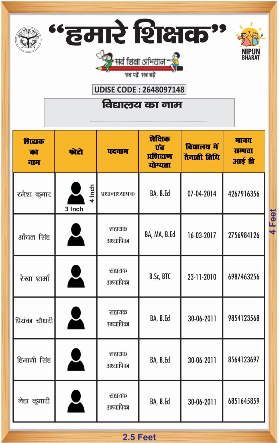 विभागीय अधिकारियों, जिला व ब्लाक स्तरीय टास्क फोर्स व अकादमिक रिसोर्स पर्सन के विद्यालयों के निरीक्षण में ‘हमारे शिक्षक’ बोर्ड का अवलोकन जरूर करें। बोर्ड सभी परिषदीय, कंपोजिट व कस्तूरबा गांधी बालिका विद्यालयों में 15 दिन में लगाया जाए। इसके लिए प्रति विद्यालय प्रति बोर्ड अधिकतम 500 रुपये धनराशि दी जाएगी। बोर्ड 2.5 गुणा 4 फिट के साइज में लकड़ी या लोहे के ऐंगल व पलैक्स शीट पर बनवाया जाए, जिसमें हर शिक्षक का फोटो 3 गुणा 4 इंच साइज का होगा।उन्होंने लिखा कि विद्यालयों में समय-समय पर विभागीय कार्यक्रम, गतिविधियों का आयोजन होता है, जिसमें जनप्रतिनिधि, अधिकारी, गणमान्य व्यक्ति, अभिभावक प्रतिभाग करते हैं। इसके अलावा अभिभावक शिक्षक बैठक, विद्यालय प्रबंध समिति आदि बैठकें आयोजित की जाती हैं।