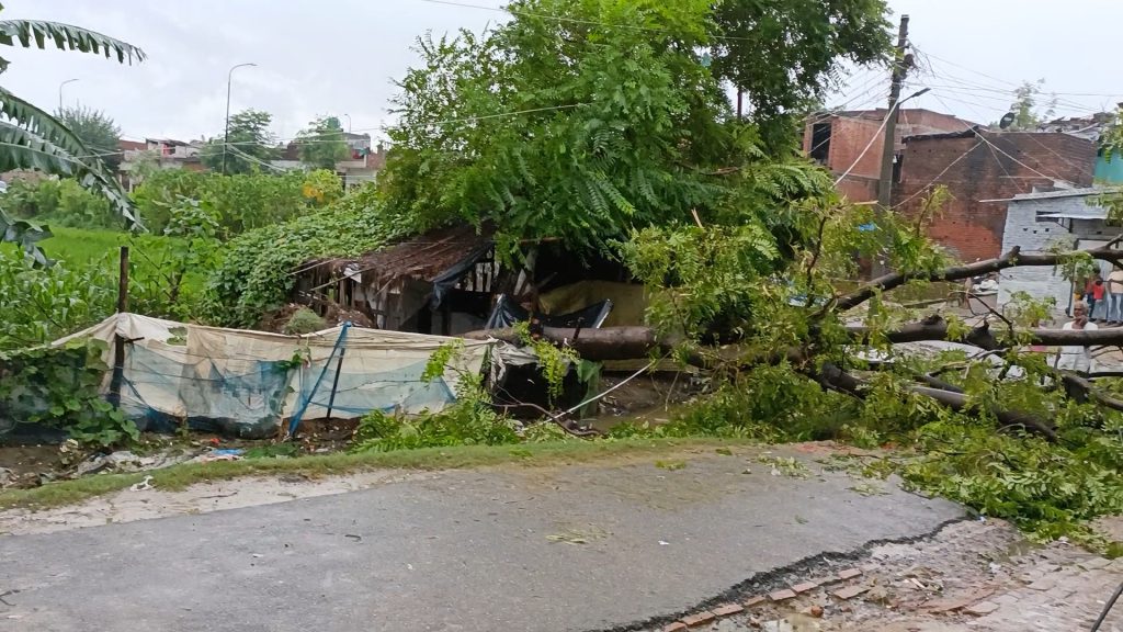 मोहल्ला नौरंगाबाद चांद मारी रोड पर महबूब अली ऊर्फ मिलावटराम की चक्की के पास विशाल पेड़ गिरने से बिजली लाइन के तार गिरे बड़ा हादसा होने से बाल बाल बचा पेड़ गिरने से आवागमन हुआ बाधित